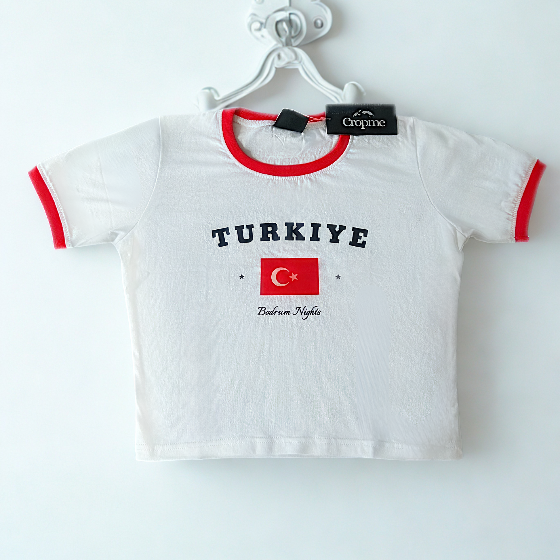 Mit dem Türkei-Flaggenprint und dem eleganten Schriftzug „Bodrum Nights“ verbindet dieses bauchfreie T-Shirt kulturelle Inspiration mit modernem Design.